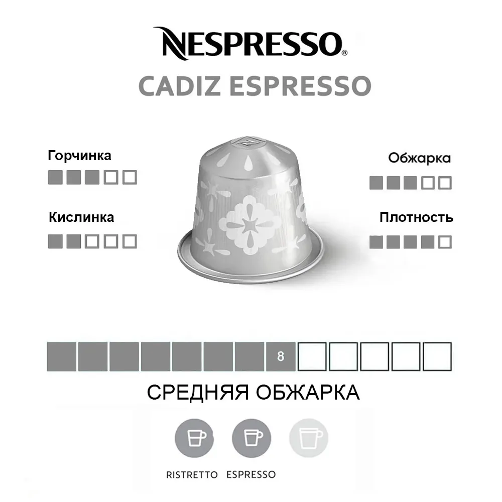 Капсулы Nespresso Original Cadiz Espresso Limited Edition — это бленд который спешку на более медленный темп и позволяет насладиться кофе в испанском стиле. World Explorations Cádiz Espresso передает вкус жизни в этом солнечном андалузском портовом городе. Смесь бразильской арабики и индийской робусты с солодовыми нотками зерна и мягкими нотками карамели способствует расслаблению.